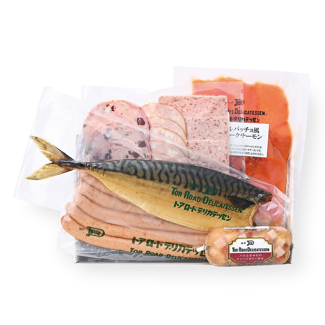プチソーセージセット160g、カルパッチョ風スモークサーモン70g、サバのスモーク(片身)、ハムと小エビのコンソメゼリー寄せ200g、ロングウインナー250g