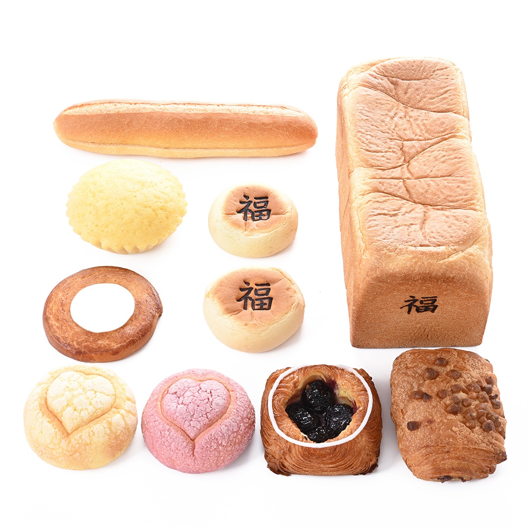 発酵バターを加えてソフトに焼き上げました。しっとりした口あたりと風味の豊かさが特長。そのままでもトーストしても楽しめる食パンです。「福」の字の焼き印を押しました。