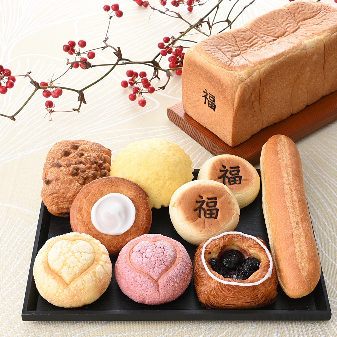 福印の入った食パン・あんぱんをはじめ、新年を迎えるお祝いのパンをアソートしました。お正月にご家族皆さんでお楽しみください。