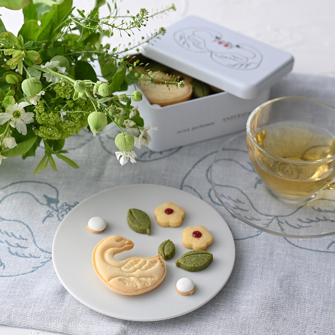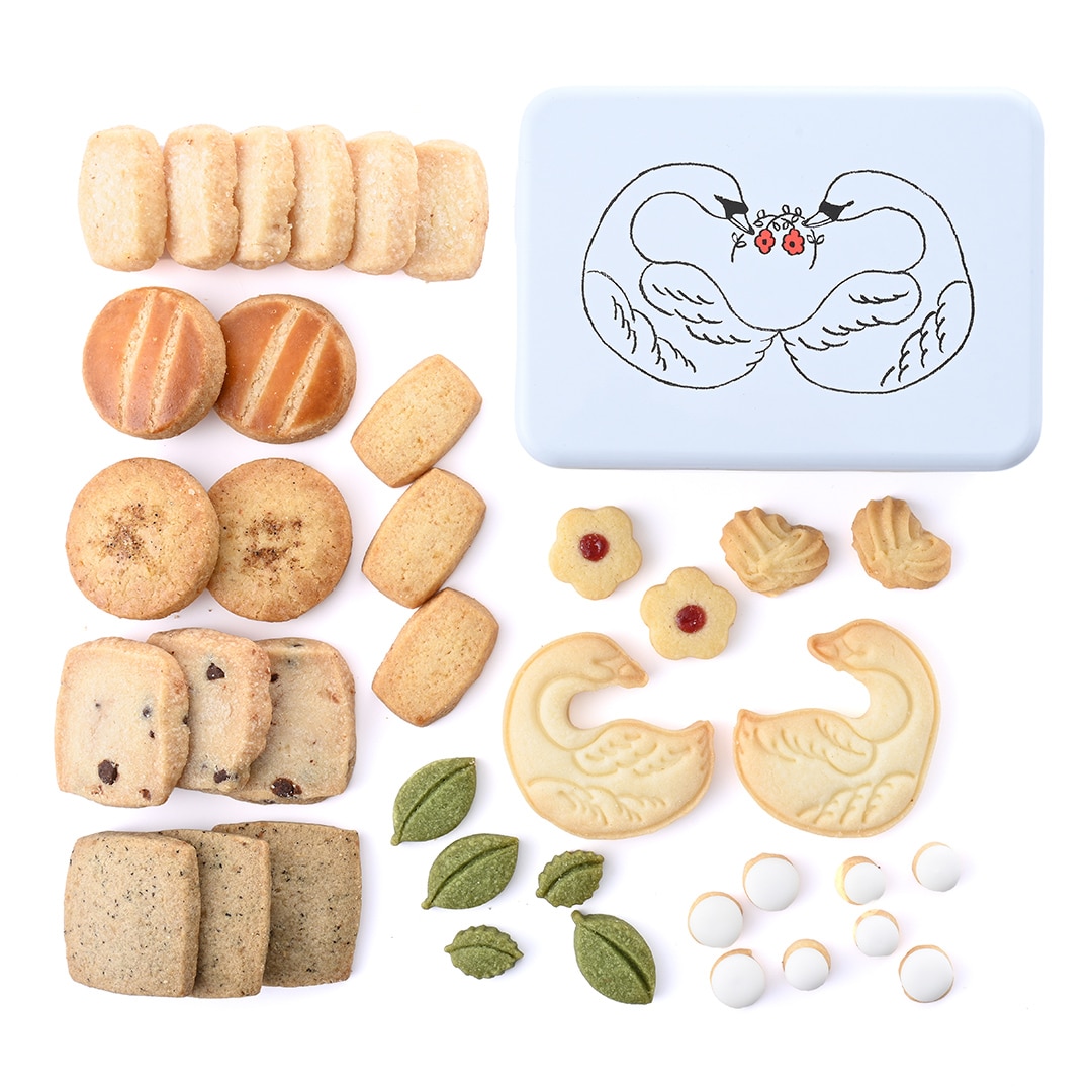 双子の白鳥が湖でゆっくりと佇んでいるひとときを表現しました。缶の中には、11種類のクッキーを詰め合わせ。