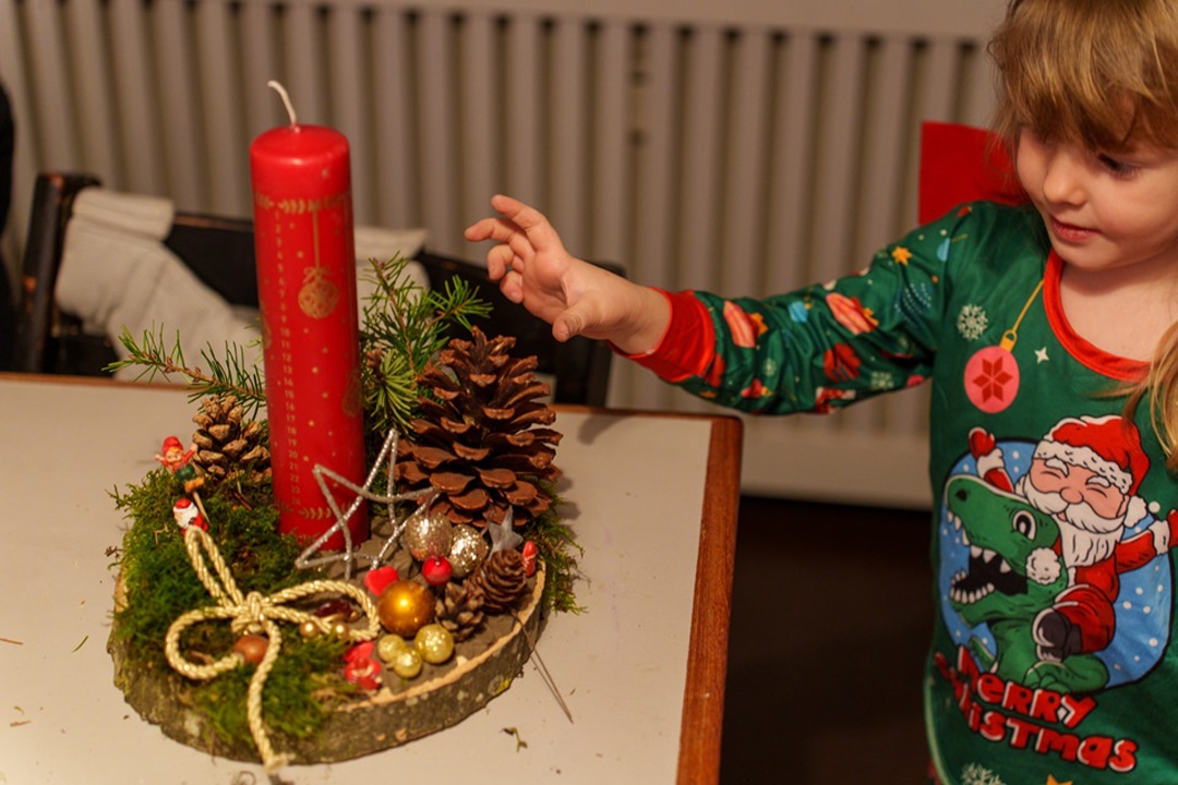 デンマークでは、クリスマスが近づくと、家族みんなで家の中を飾り付けするんだ。アドベントキャンドルも手作りするよ。
