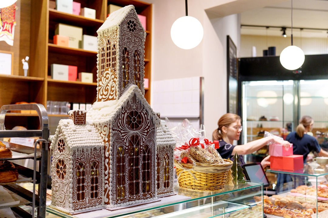 このジンジャーブレッドハウスは洋菓子製造のスタッフが作ったものなんだ。細かい装飾がきれいだね。