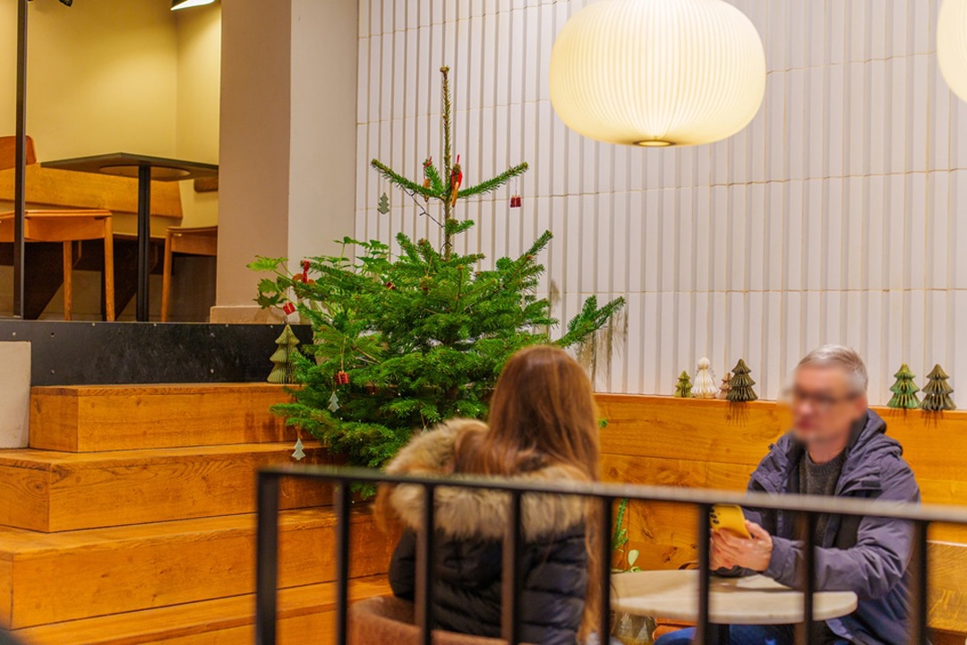 イート席には本物のモミの木を飾っているよ。これからクッキー生地で作ったハートを飾ったり、ライトもつけるんだ。
