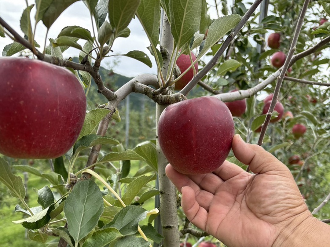 りんごは、紅玉の収穫・選果を10月初旬に終えました。梅雨期の少雨と猛暑で小玉傾向が目立ち、高温による日焼けや落果も多く、収穫量は前年より少なくなりました。シナノゴールドの収穫は10月下旬から、グラニースミスは11月中旬から収穫予定です。今年は夜温が高く夜蛾の活動が活発で、特にシナノゴールドで吸汁被害による腐敗が多発したため、来季は防蛾灯・防虫灯を設置し、安定した結実と収穫を目指します。