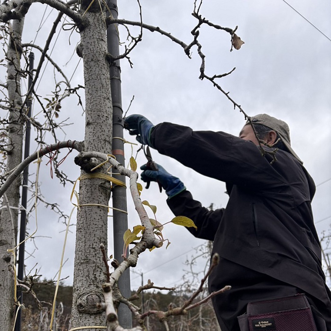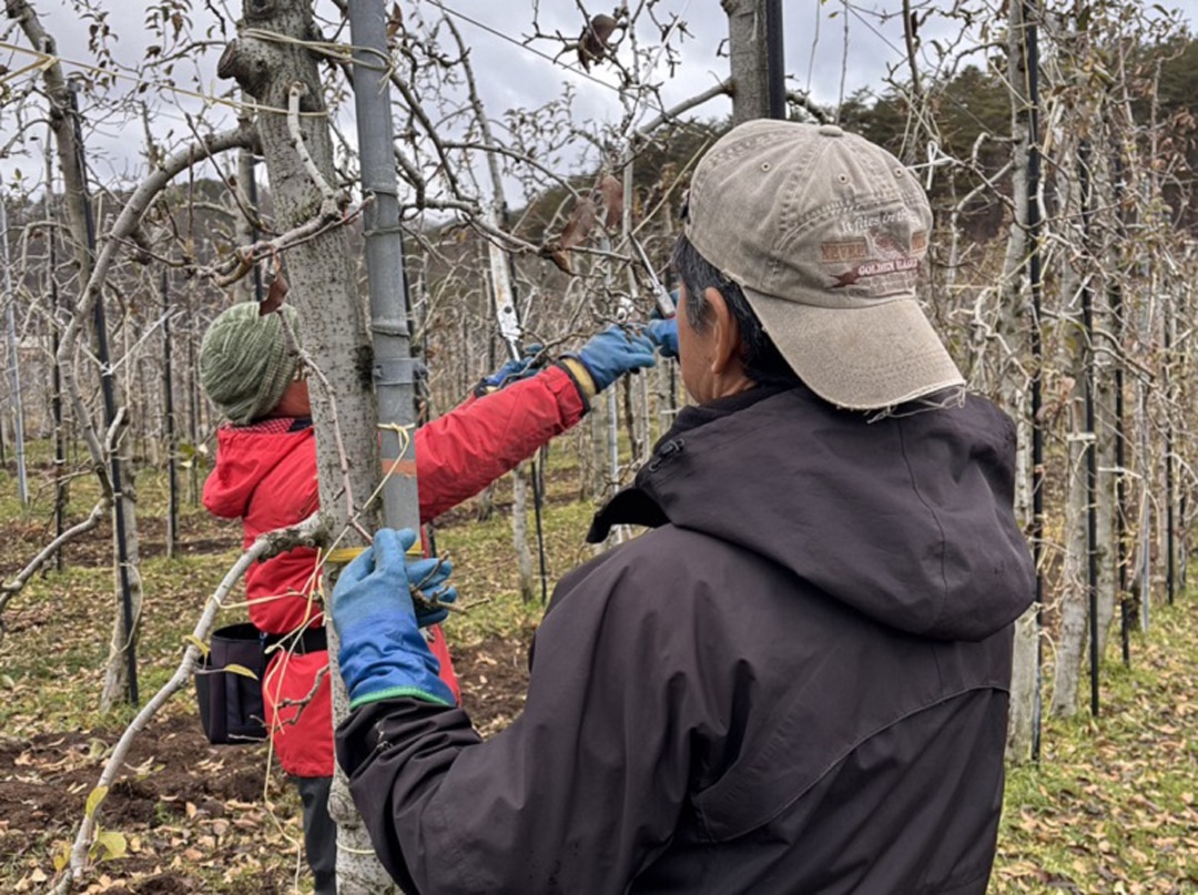 今季は、シナノゴールドが夏の猛暑で樹が弱り、炭疽(たんそ)病や夜蛾(やが)の吸汁の影響を受けました。一方、暑さに強いオーストラリア原産のグラニースミスは健闘したものの、カメムシの被害が目立ちました。だからこそ冬の手入れは欠かせません。剪定は12~3月、日当たりや風通しを想像しながら不要な枝を間引き、切り詰め、誘引して樹形を整えます。判断が難しいため必ず2人以上で相談し、伐根は株まで掘り上げて更新準備。苗木を補植し、畑の未来をつないでいきます。