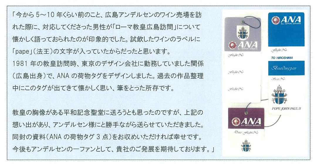 1981年、2月23日から4日間来日された、ローマ法王ヨハネ・パウロ二世の午餐を広島アンデルセンがご下命賜りました。