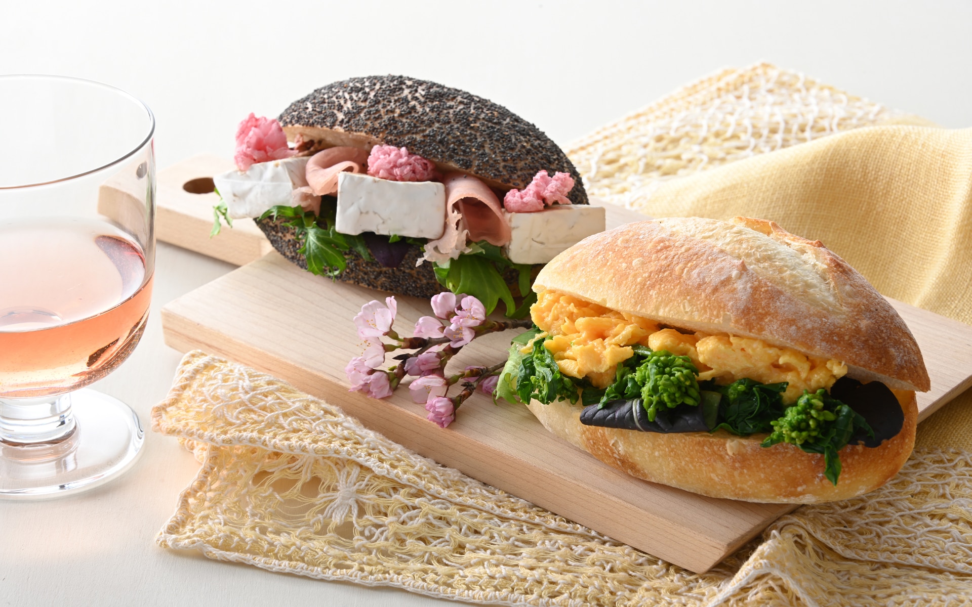 国産小麦のロールパン(プレーン)にリーフ野菜、スクランブルエッグ、菜の花をはさめば完成です。